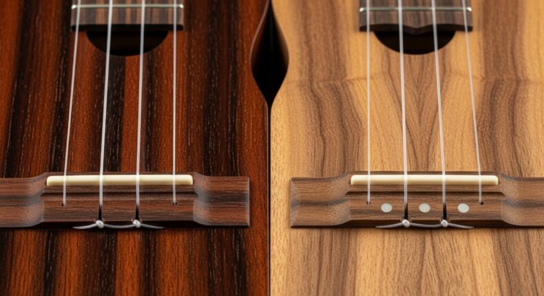 …とはいえ、これは単板(一枚板)の高級なギターなどで比べた場合の話かもしれません。AUシリーズのような合板ボディのウクレレで、しかも指板という小さなパーツの違いですから、その差は非常にわずかだと思います。材質の違いを過度に心配する必要は全くないかな、と私は思いますよ。