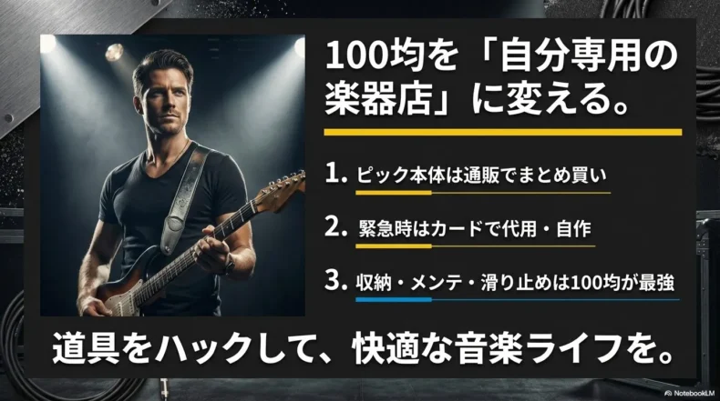 この記事を読み終える頃には、あなたはもうピックがなくて困ることはありません。それどころか、100均を「自分専用の楽器店」のように使いこなせるようになっているはずです。