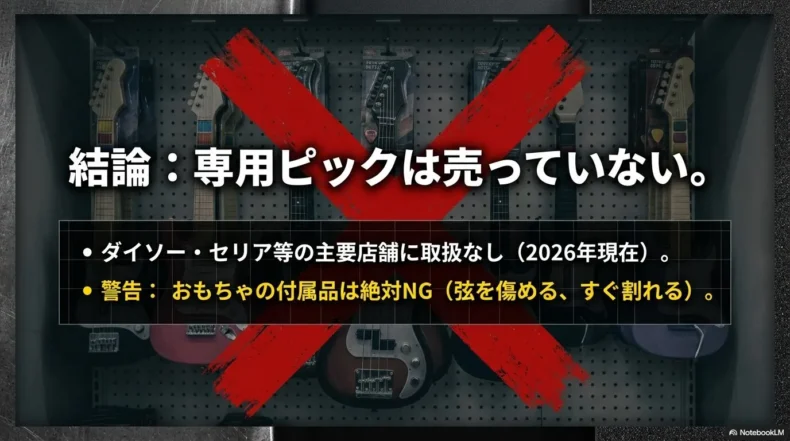 まず、最初にお伝えしなければならない厳しい現実があります。あなたが今、100円ショップに「演奏用のピック」そのものを買いに行こうとしているなら、一旦落ち着いてこの記事を最後まで読んでください。