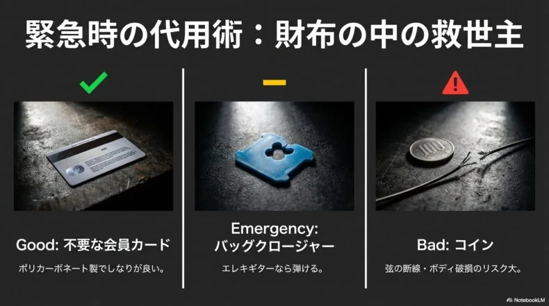 代用品選びで最も重要なのは「素材の硬度」と「弦へのダメージ」のバランスです。一番有名なのは、クイーンのブライアン・メイのように「硬貨(コイン)」を使う方法ですね。