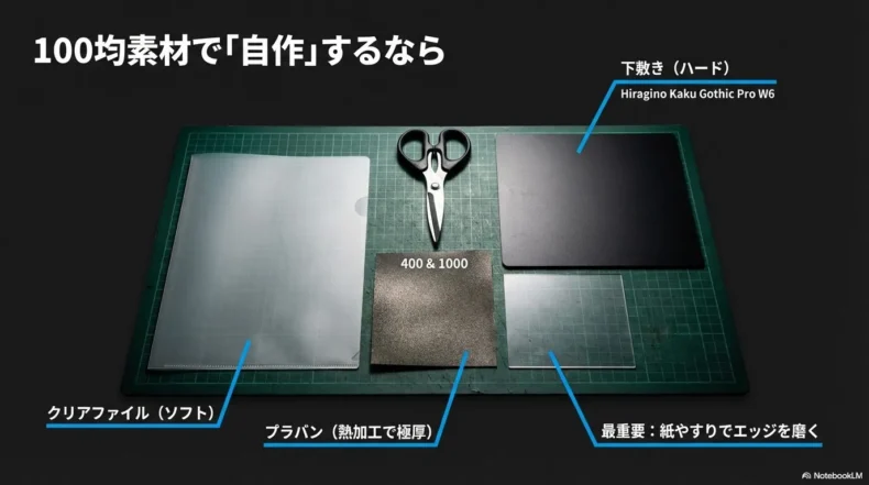 代用品をそのまま使うのが「応急処置」なら、100均の素材を加工して自分の形にするのは「クリエイティブな挑戦」です。市販品にはない自分だけの「厚さ」や「質感」を追求できるからです。