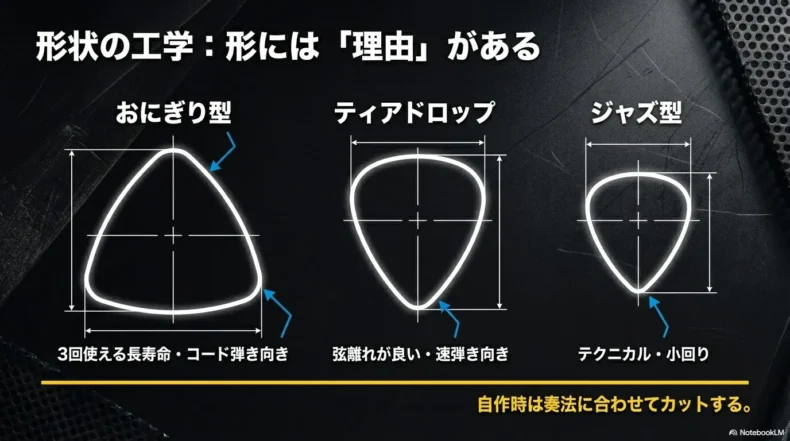 もし100均の素材から自分好みのものを切り出すなら、まずは「形状」の工学的な意味を理解しておくべきです。私はベースを弾く際、楽曲のテンポや弦の太さに合わせて形状を使い分けています。