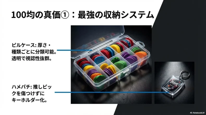 私も長年、このピルケースを楽器ケースのポケットに忍ばせていますが、これほど機能的なものは他にありません。楽器店で売られている小さな円形のピックケースは、数枚入れるとパンパンになりますが、100均の連結ピルケースなら、「厚さ」「形状」「素材」ごとに完璧に分類して収納できるのです。