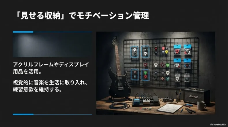 例えば、アクリル製のコレクションケースに、自作のプラバンピックや歴代の愛用品を並べるだけで、デスクの上が一気に自分だけの音楽ブースに変わります。また、壁掛けできるネットとクリップを組み合わせれば、「必要な時にすぐ手に取れるピックホルダー」を壁面に作ることもできます。