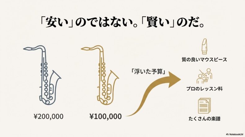 「自分に向いているか分からない新しい趣味に、最初から20万円以上の大金を出すのはちょっと勇気がいる…」と躊躇してしまう気持ち、本当によく分かります。アンティグアを選ぶ最大のメリットは、この浮いた予算を「上達を早めるための投資」に回せることにあります。例えば、吹き心地を劇的に変える質の良いマウスピースを買い足したり、プロの先生に習うレッスン代に充てたりできるわけです。この「始めやすさと上達への余力」こそが、アンティグアが誇る最高のコストパフォーマンスだと言えるでしょう。
