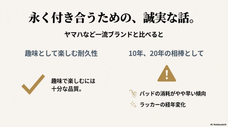 パーツ一つ一つの工作精度や、素材そのものの純度・質においては、やはりヤマハなどの国内一流メーカーの方が一段上の基準で作られています。もしあなたが「10年、20年と一生モノの相棒として、ボロボロになるまで毎日吹き倒したい」と考えているなら、最初から上位ブランドを選んだ方が、結果的にパーツ交換などの維持費を抑えられ、安上がりになる可能性があることは心に留めておいてください。