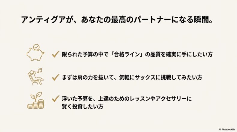 ここまで詳しく解説してきましたが、サックスのアンティグアの評判をまとめると、それは「高すぎる価格の壁を打ち破り、誰もが音楽の世界へ飛び込めるようにした功労者」だと言えるでしょう。完璧な工芸品としての骨董価値を求めるのではなく、「今日この瞬間から、サックスという楽器で自分を表現してみたい」という情熱を、最も効率よく形にしてくれる実直なパートナーです。