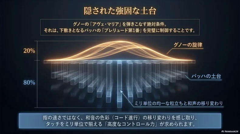 バッハのプレリュードを単なる「指の運動」として終わらせず、和音の美しさを味わい尽くす気持ちで取り組むことが、結果的にグノーのアヴェ・マリアを美しく弾きこなすための最強の土台となります。この土台さえしっかりしていれば、上にどんなメロディが乗ってもブレることはありません。