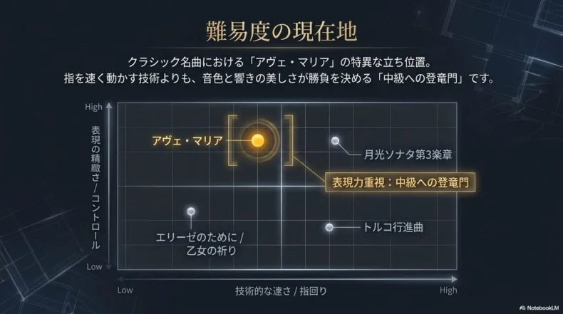 こうして客観的なデータとして俯瞰してみると、グノーのアヴェ・マリアはまさに「中級の登竜門」として非常に適した、バランスの良い名曲であることがはっきりとわかりますね。
