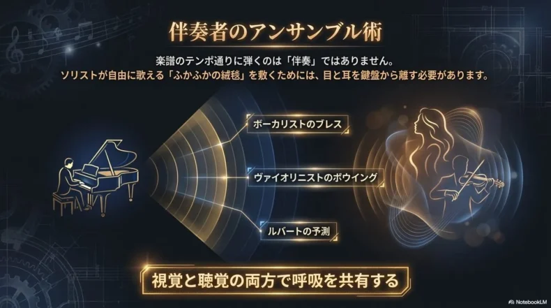 ピアノの鍵盤だけを見つめるのではなく、ソリストの背中の動きや息の吸い方(ブレス)を視覚と聴覚の両方で察知し、一緒に呼吸を合わせることが伴奏成功の絶対条件となります。