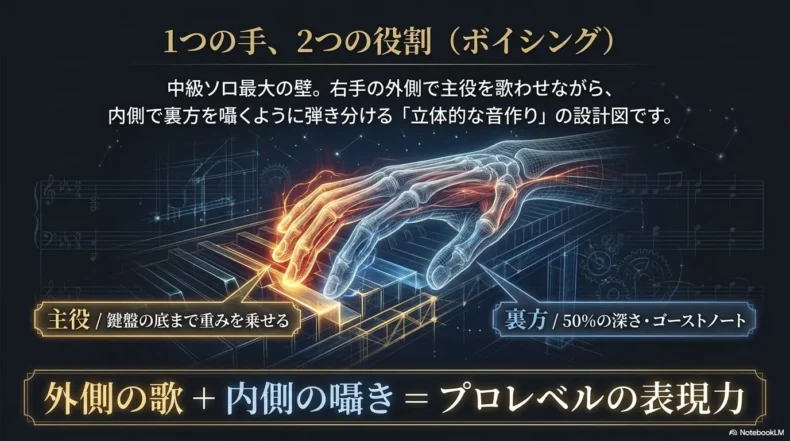 具体的には、右手の小指や薬指(外側の指)でメロディの音を強く長く響かせながら、同時に親指や人差し指(内側の指)で伴奏の16分音符を「極めて弱く、滑らかに」弾くという技術が求められます。