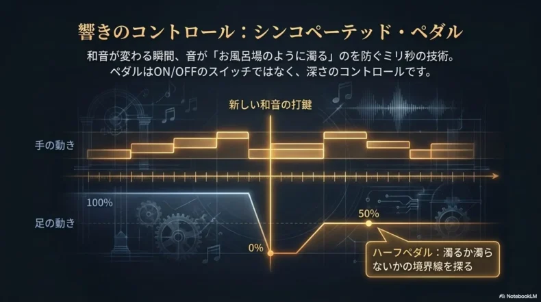 そのため、和音が変わるその瞬間に、直前までの音が濁らないよう確実にペダルを踏み変える「シンコペーテッド・ペダル(踏み替えペダル)」という高度な技術が必要不可欠です。
