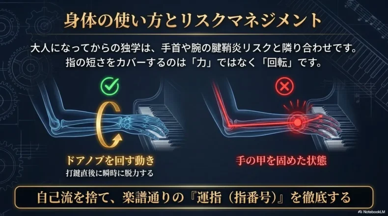 鍵盤を押さえるごとに手首を左右に柔軟に回転(ローテーション)させ、弾き終わった指から瞬時に力を抜く「脱力」を意識することが不可欠です。