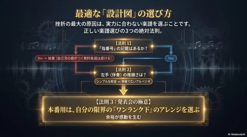 人間の脳は、あまりにも高すぎる壁の前では学習意欲を失ってしまいます。自分が「少し練習すれば弾けそう」と思えるレベルを選ぶのが事実に基づく成功法です。