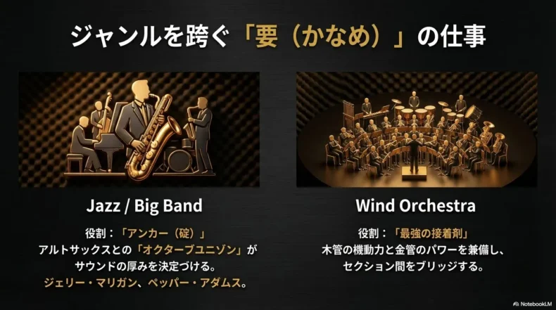 アンサンブルにおいてバリトンサックスが果たす役割を整理すると、その重要性がより鮮明になります。