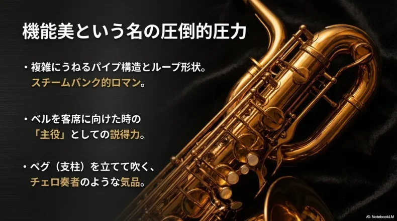私はスチームパンクのようなデザインが好きなのですが、バリトンサックスの造形にはそれに通じるロマンを感じずにはいられません。