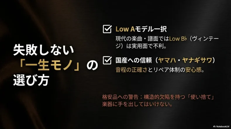 まず検討すべきは、最低音のキーが「Low A」か「Low Bb」かという点です。