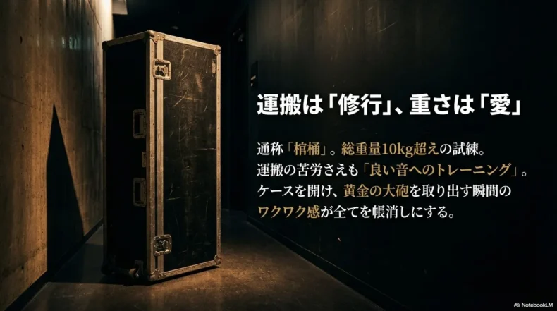 総重量は10kgを優に超え、移動のたびに奏者の体力と精神力を削り取ります。