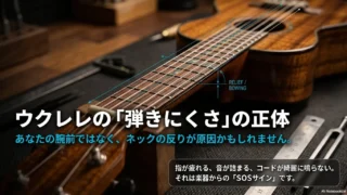 ウクレレのネック反り(順反り・逆反り)の原因と確認方法を画像なしで解説。トラスロッドがない場合のアイロン修理や費用相場、自分でできるサドル調整、湿度管理など、長く弾くためのメンテナンス術をバンドマン視点で網羅します。