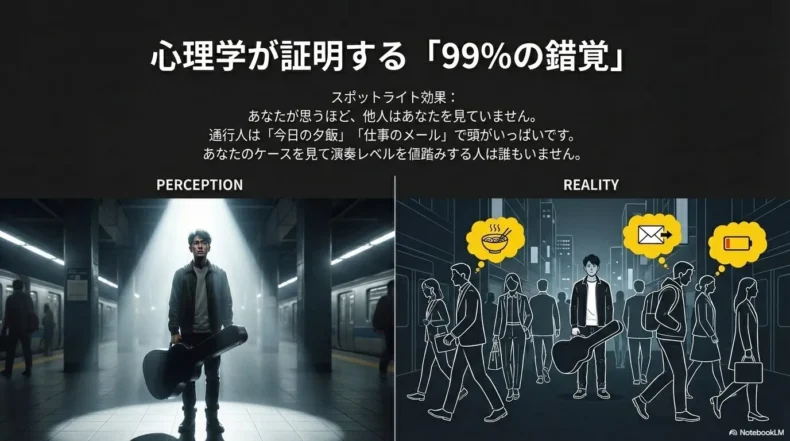心理学には「スポットライト効果」という言葉があります。これは、自分が思っている以上に他人は自分のことに注目していないにもかかわらず、「常に誰かに見られている」「一挙手一投足を評価されている」と錯覚してしまう心理的バイアスのことです。楽器の持ち運びにおける「恥ずかしい」という感情の大半は、他人の評価ではなく、このスポットライト効果によって自分自身が作り出した幻想だと言えます。
