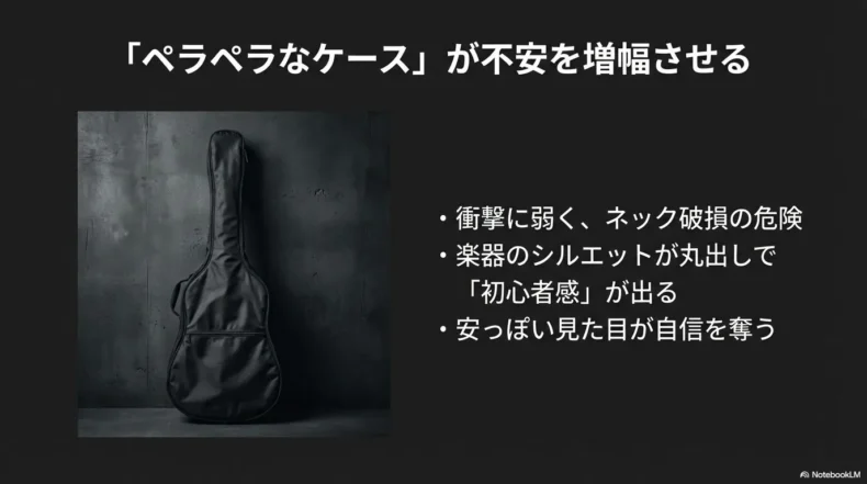 見た目の問題もさることながら、このペラペラなケースには、楽器の運搬において非常に深刻なリスクが潜んでいることを、初心者の多くはご存知ありません。この種のケースは内部のクッション性が極めて低いため、電車内で壁に軽くコツンとぶつけたり、駅の改札やドアの枠に少し擦ったりしただけで、内部の楽器本体に直接衝撃が伝わり、容易に塗装の剥がれや木材の破損を引き起こしてしまう危険性が常に伴います。