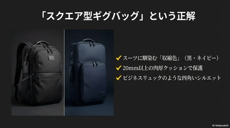 ・ペラペラの付属ケースは卒業し、黒やネイビーの「スクエア型ギグバッグ」を選ぶと、スーツや街の風景に自然に馴染みます。