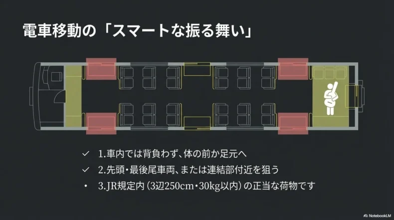 - ドア付近は絶対に避ける:乗降客の動線となるドア付近に大きな荷物を置いて立ち止まるのは、最も迷惑がられる行為であり、他人のカバンが引っかかって楽器が破損するトラブルの元です。乗車したら速やかに奥へ進みましょう。