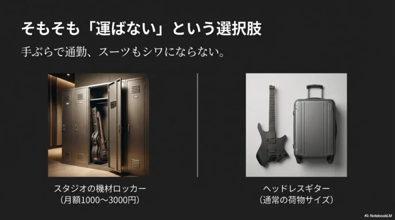 また、ケース選び以外の解決策として、「物理的に持ち運ぶ回数を減らす」という根本的なアプローチもあります。例えば、会社の近くやよく利用する練習スタジオの月額ロッカーをレンタルし、平日の仕事終わり練習用としてそこに一本、ミドルクラスのギターを置いておくのです。ポイント移動でのストレスや、スーツにシワが寄ることを一切気にする必要がなくなり、手ぶらでスマートに大人の音楽を楽しむ余裕のあるライフスタイルが実現します。ロッカー代という初期投資はかかりますが、大人の趣味としては非常に費用対効果の高い、賢い選択肢だと言えるでしょう。