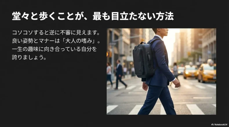 ・背中の中央に重心が来るようストラップを短く締め、胸を張って堂々と歩くのが最も目立たない最大のコツです。