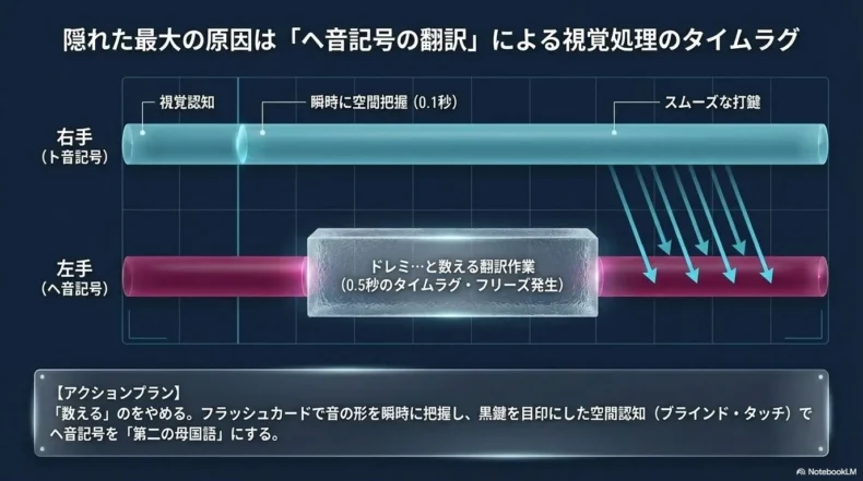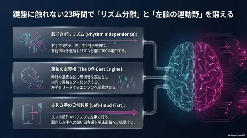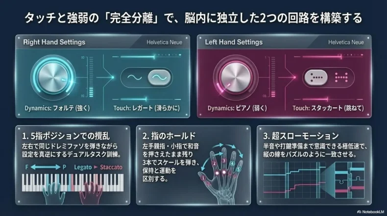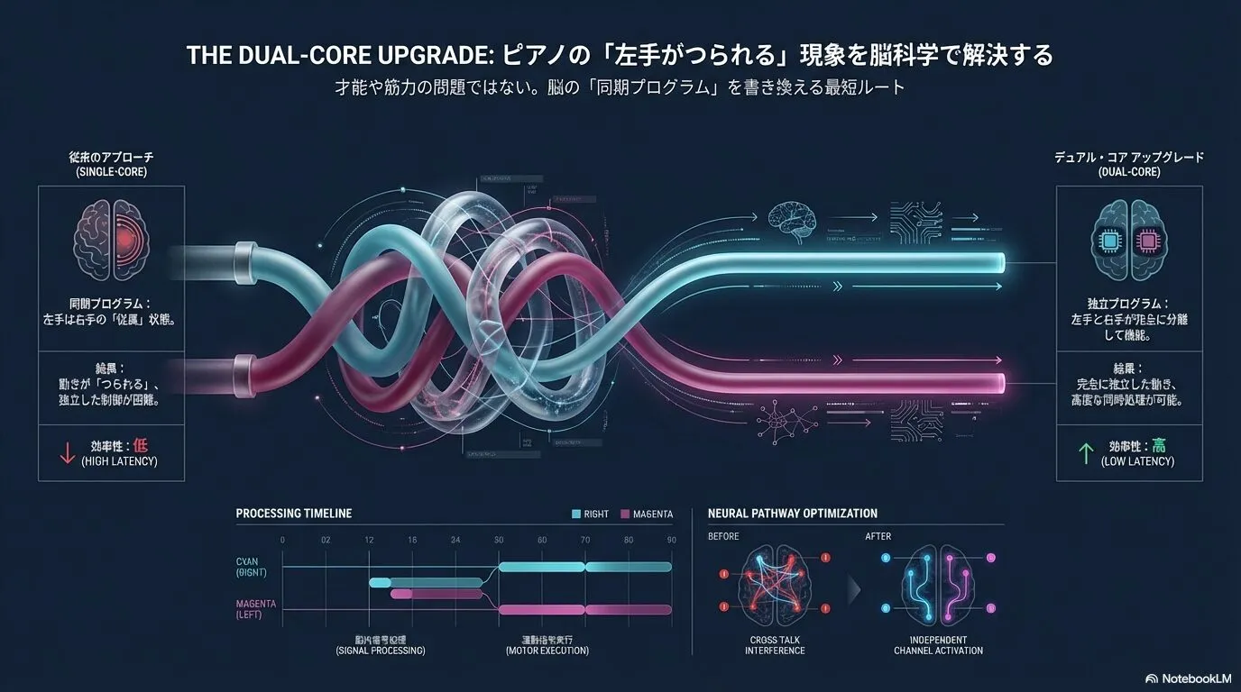 • 対策: 「超スロー練習」で脳に別々の回路を作り、左手の動きを「無意識レベル」まで自動化させる。