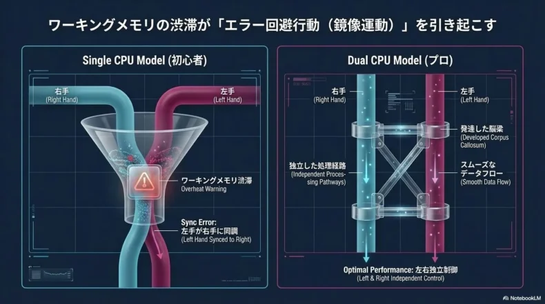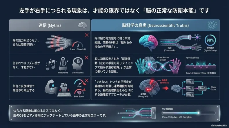 • 原因: 左手がつられるのは才能のせいではなく、脳の「同期プログラム」による正常な反応。