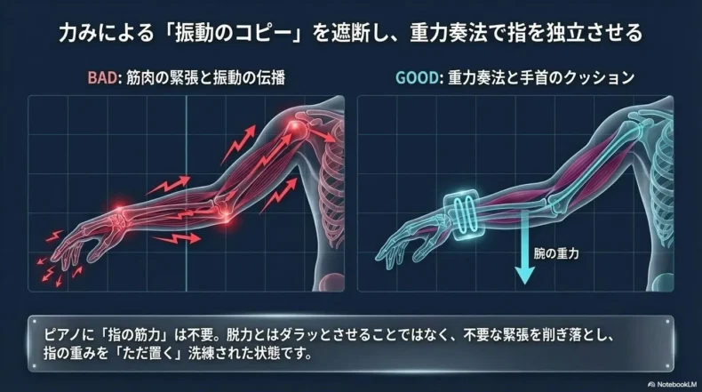 ここまで、非常に長い時間をかけて「ピアノの左手がつられる」という問題の正体と、その具体的な処方箋についてお話ししてきました。