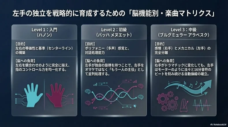 左手が独自の旋律(メロディライン)を持つことで、脳は左手を「右手のオマケ」ではなく、「もう一人の主役」として認識せざるを得なくなります。