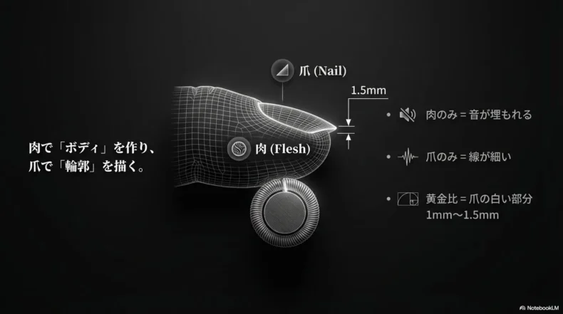 肉で弦を捉えて音の「ボディ(太さ)」を出し、爪で弦を弾いて音の「エッジ(輪郭)」を作る。この両方の良さを引き出せるバランス点が、指先から1mm〜1.5mmという長さなのです。