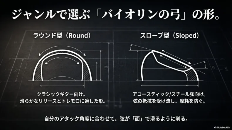 道具が揃ったところで、いよいよ実践的な「削り方」について解説します。良い音色を作るための削り方の極意は、形(シルエット)を作ること以上に、「爪の断面(エッジ)を徹底的にツルツルに磨き上げること」にあります。ここをおろそかにすると、どんなに良いギターを使っても、ノイズ混じりの安っぽい音になってしまいます。