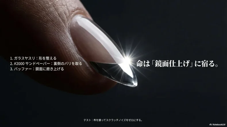 初心者がよく陥るミスとして、「粗いヤスリで長さを整えて終わり」にしてしまうケースがあります。しかし、ヤスリで削った直後の爪の断面は、顕微鏡レベルで見るとノコギリの刃のようにギザギザの状態です。このまま弦を弾くと、「ジャリッ」「カサッ」というスクラッチノイズが発生し、音の芯がぼやけてしまいます。弦の寿命を縮める原因にもなります。