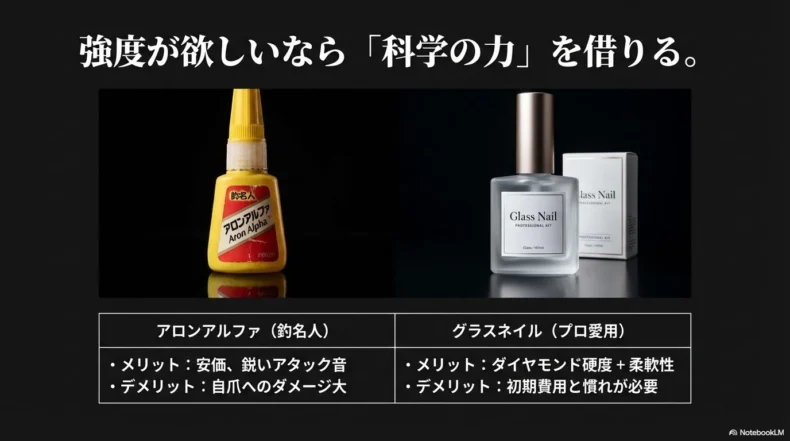 本来は釣り具(浮きやガイド)の補修用ですが、この「釣名人」は水のようにサラサラとした液状で、爪の微細な凸凹に驚くほど浸透します。一般的なゼリー状の接着剤や100均の瞬間接着剤だと、どうしても気泡が入ったり、厚ぼったくなりすぎて違和感が出たりします。しかし、釣名人は薄く硬い層を作ることができるため、まるでガラスのような硬度と、キンキンと響く鋭いアタック音を手に入れることができます。