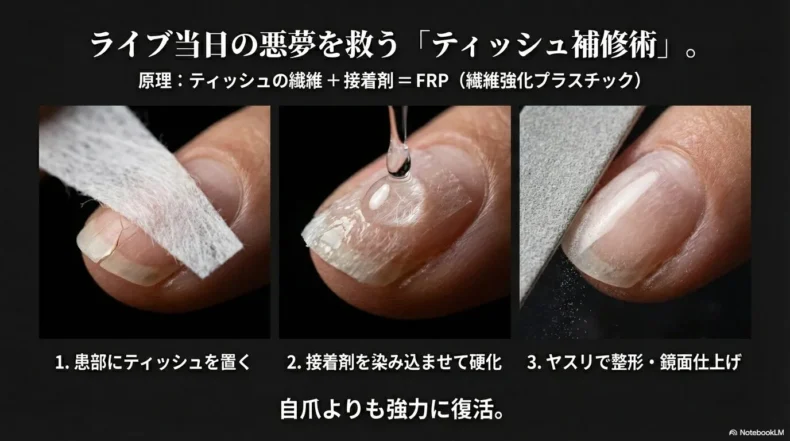 • ライブ当日に爪が割れても「ティッシュと接着剤」で即座に復活できる