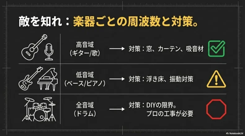 自分の演奏する楽器の特性、つまり「音域(周波数の高さ)」「音圧(デシベル数)」「音の出る方向(指向性)」を正確に把握することが、最もコストパフォーマンスの高い対策の第一歩となります。