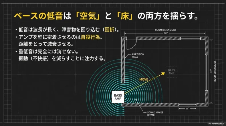ベースの音を空間で遮断するには、「質量則」と呼ばれる物理法則に従い、徹底的に重くて密度の高い素材(コンクリートや鉛)を分厚く使うしか本来の解決策はありません。