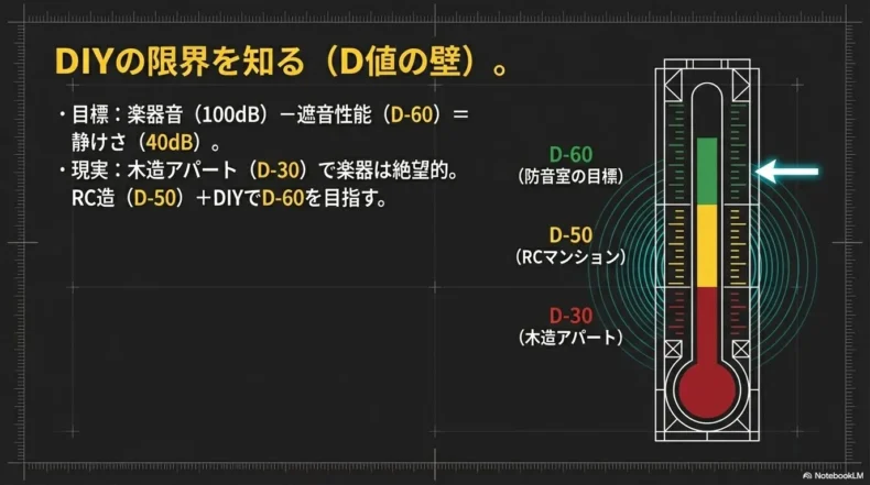 D-60という数値は、プロの音楽スタジオや、数百万円かけて本格的な防音リフォームを行った部屋でようやく達成できるレベルです。一般的な賃貸マンションでこの数値を叩き出すのは、DIYではほぼ不可能に近い領域です。