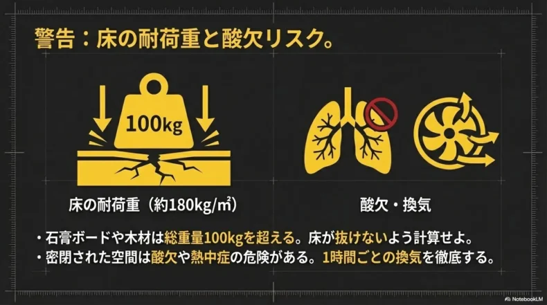 石膏ボードや木材を多用するこの方法は、完成するとかなりの重量(壁一面で数十キロ〜100キロ超)になります。賃貸物件の一般的な床の耐荷重(約180kg/㎡)を超えないよう計算し、また地震による転倒防止の安全対策を必ず行った上で、完全な自己責任で作業してください。