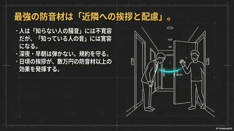 防音グッズに頼り切るのではなく、最終的に一番大切なのは「隣人への人間的な配慮」です。深夜や早朝の演奏は絶対に控え、日頃からすれ違った際に気持ちよく挨拶を交わすなど、良好な関係を築いておくことも、ある意味で最強の「トラブル防止・防音対策」と言えるかもしれません。
