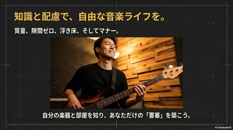 低音楽器を弾く方は、壁の対策に何万円もかけるよりも、まず「床の防振と質量の追加」を最優先に行ってください。それがベーシストとしての最低限のモラルだと私は考えています。