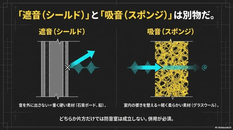 防音対策について調べ始めたばかりの方が最も陥りやすい痛恨のミスが、「遮音」と「吸音」の役割を完全に混同してしまうことです。ここを間違えると、部屋の音が異常な状態になります。