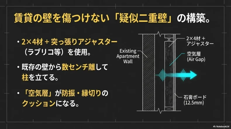 既存の壁の手前に、床と天井を強力に突っ張る形で新しい柱を立て、そこに重い遮音材を打ち付けていく、画期的かつ現状復帰可能なDIY手法です。部屋の中に「もう一つの壁」を作ってしまうイメージですね。
