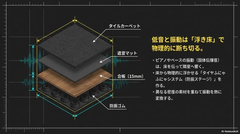 高密度の遮音マットと、振動を熱に変換して吸収する防振マットを何層にも重ねて敷くのが、最も効果的かつ確実なアプローチです。