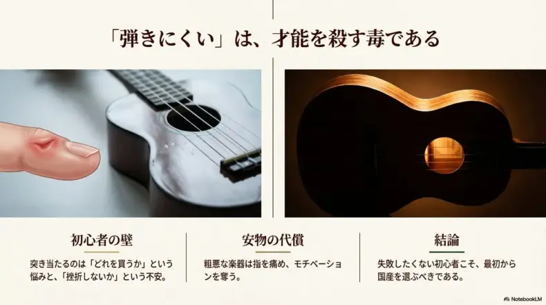 2. 心理的安全性: 「弾きにくいのは自分の才能がないせいだ」と思い込んで挫折する初心者は後を絶ちません。しかし、国産ウクレレの圧倒的な弾きやすさは、「自分にもできる!」という成功体験を早期に与えてくれます。この心理的充足感こそが、楽器を長く続けるための最強のガソリンになります。