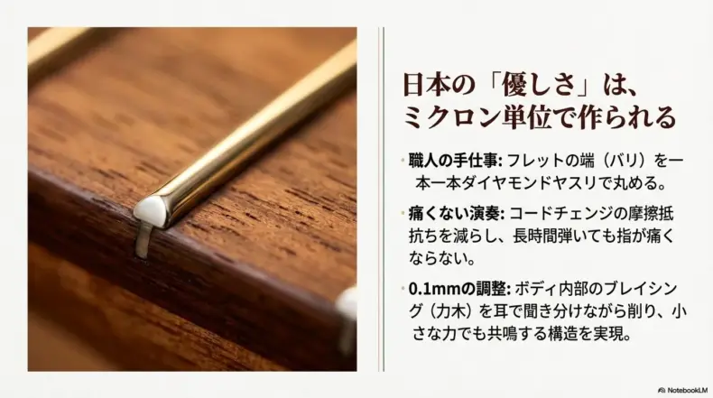 国産の主要ブランドは、この「演奏性」に対して異常なまでのこだわりを持っています。例えば、フレットの端の処理。安価な海外製はここが尖っていて、指をスライドさせた時に「チクチク」と刺さるような痛みを感じることがありますが、国産は一本一本、職人がダイヤモンドヤスリで角を丸く削り出しています。この小さな「優しさ」の積み重ねが、コードチェンジの際の摩擦抵抗を劇的に減らし、長時間の練習でも指の腹が痛くなりにくい環境を作ってくれるのです。