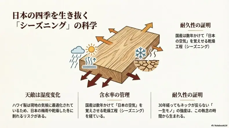 その点、国産ウクレレは「日本の環境で使うこと」を前提に設計されているため、気候変化に対する耐性が非常に高いのが特徴です。具体的には、木材の乾燥工程において、日本の平均的な湿度に合わせた含水率管理が数年にわたって徹底されています。一度木材を完全に乾燥させ、再び日本の湿度に戻す「シーズニング」という工程を何度も繰り返すことで、木材の細胞レベルで「日本の空気」を覚え込ませるのです。